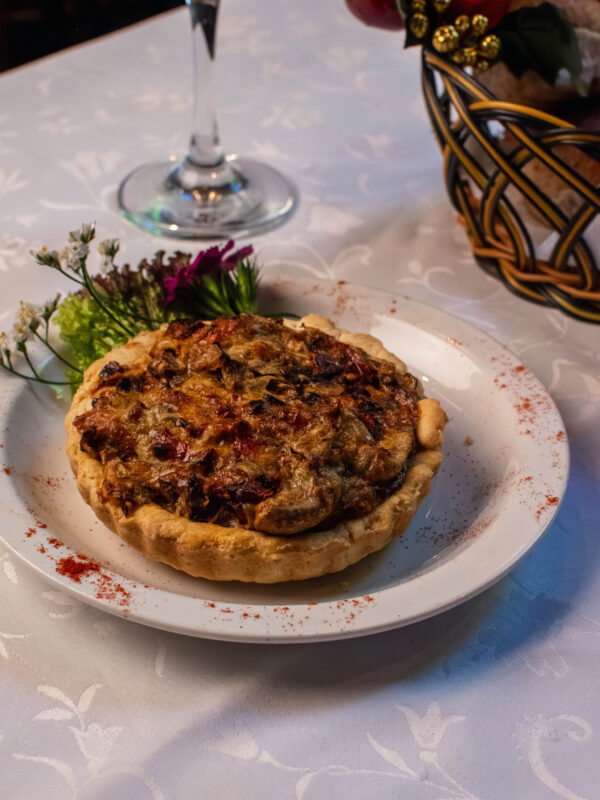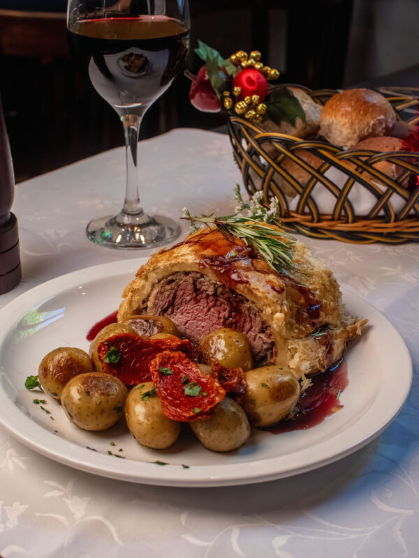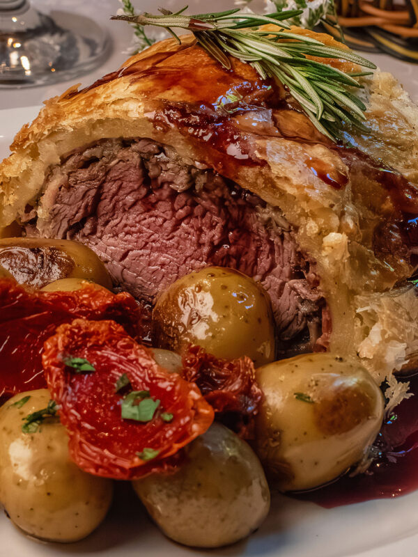 Lomo Wellington con papines andinos asados con hierbas frescas (lomo envuelto en jamón crudo, champiñones y masa de hojaldre).