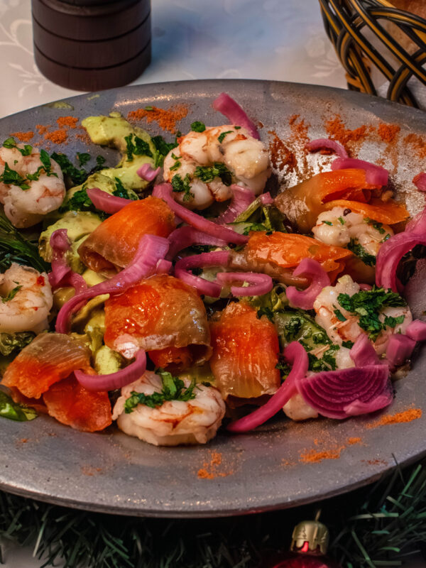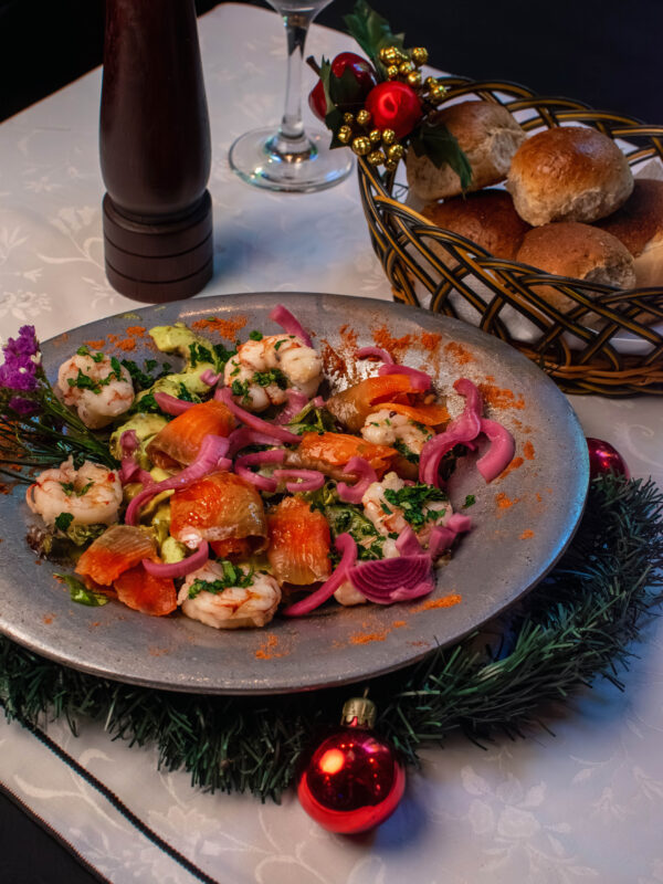 Langostinos, gravlax de trucha y palta sobre mix de hojas verdes, pepino en pickle y cebolla colorada.