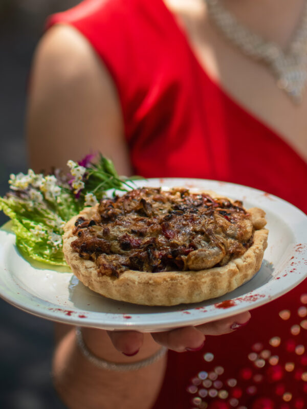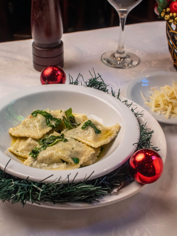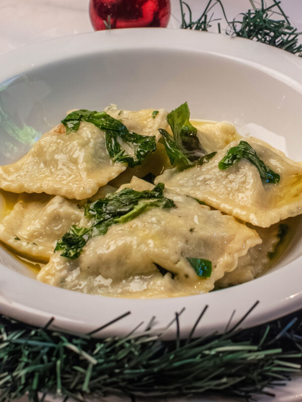 Raviolones de hongos silvestres, espinaca, nueces y queso feta con una salsa de manteca clarificada y salvia.