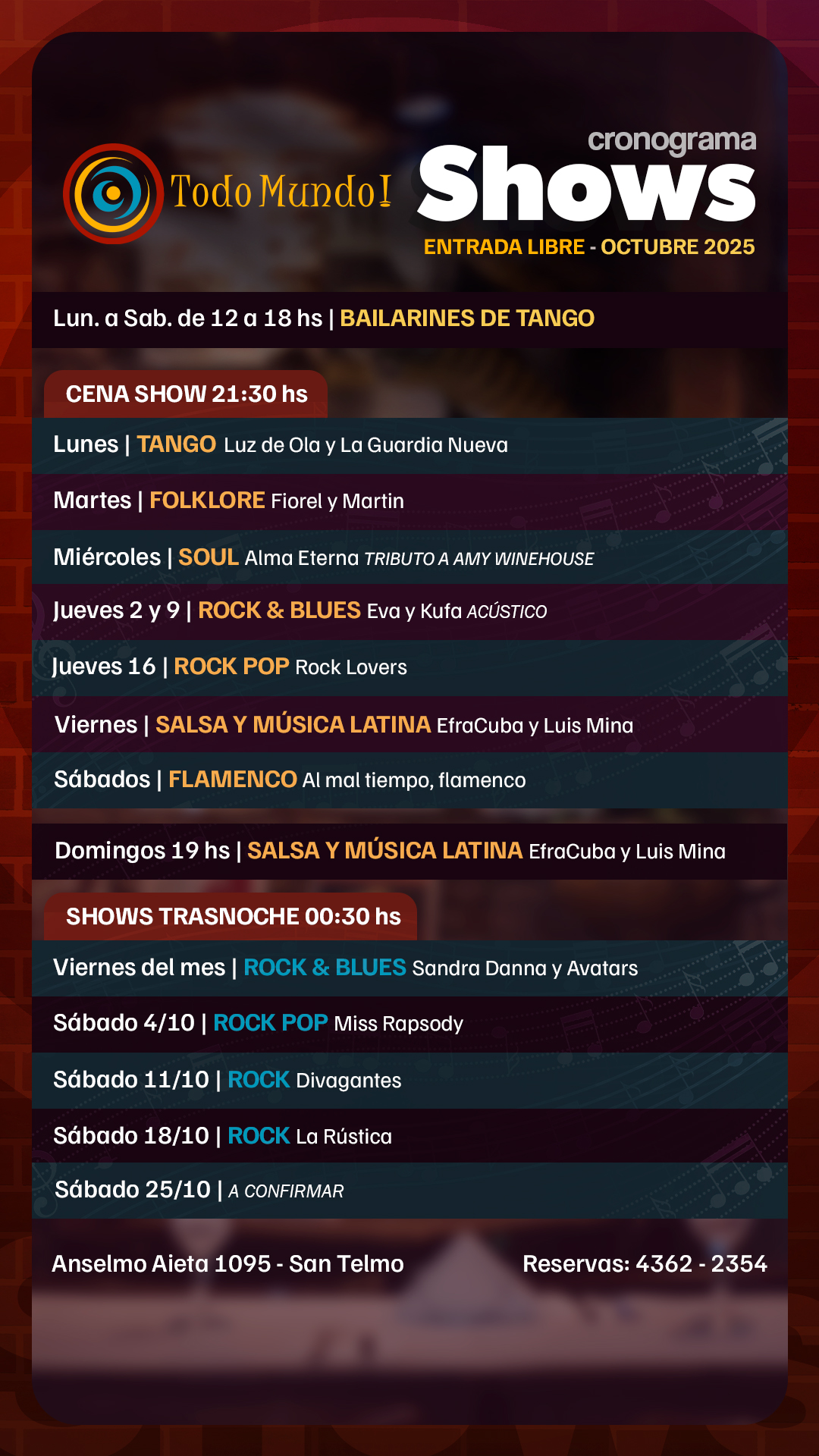 Si estás interesado en tocar o realizar un show en Todo Mundo mándanos tu material y propuesta a todomundosantelmo@gmail.com Gracias !